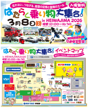 「はたらく乗り物大集合in HEIWAJIMA 2026」は、~忘れない、つなげる。能登の記憶と復興へのエール~と題して、能登半島地震の記憶を風化させることなく、被災地への想いをつなぎ復興を応援し続けること、そして防災意識の向上を目的としたイベントです。