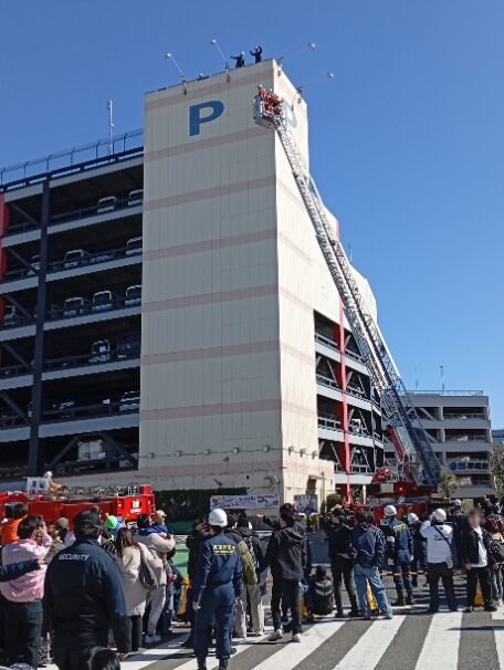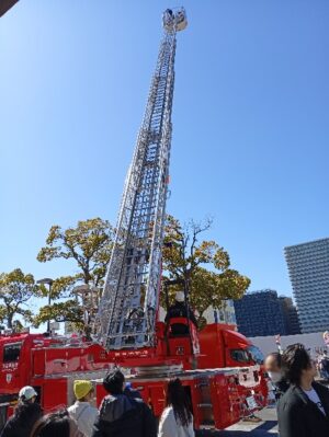 消防署によるはしご車での救護活動や放水活動の実演は、たいへんな迫力でした。
