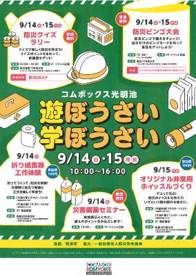 9月14日・15日にコムボックス光明池様(大阪府和泉市室堂町、https://www.dr-sc.com/combox/)で防災イベント「遊ぼうさい 学ぼうさい」を実施しました。